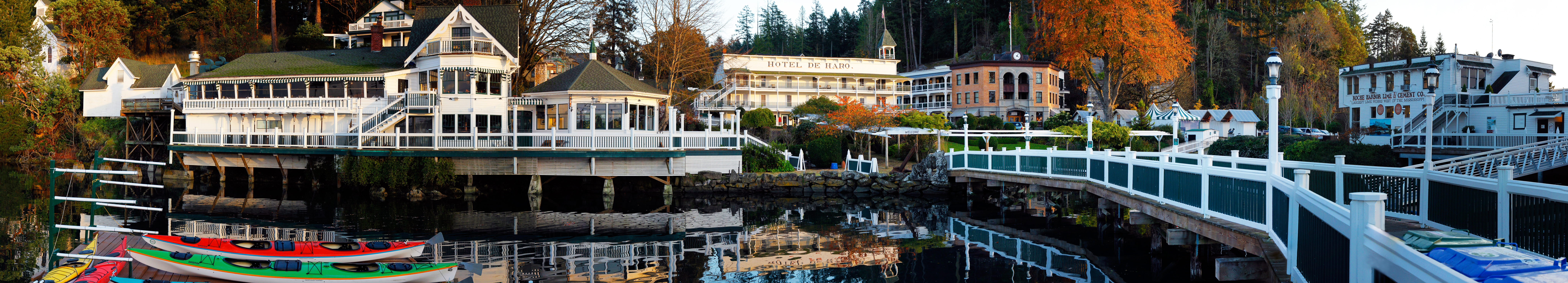 In this panorama of historic Roche Harbor, Washington, the warm light light of the end day echoes fall vibrant fall colors and provides a nice reflection in the harbor’s still water.